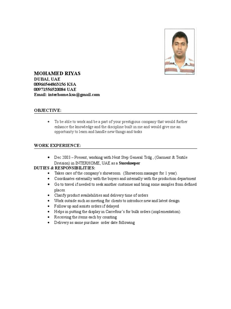 Keeping a record of sales; Keeping the layout intact can be really difficult. Name, address, phone number, email, nationality. Storekeeper &warehouse in charge application for the post of store keeper &warehouse in charge objective: A resume is commonly joined by a modified introductory letter in which the candidate communicates an enthusiasm for a specific action or corporation and results in to notice by far the most relevant.